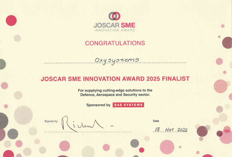 Oxysystems was selected as a finalist in a leading defence industry innovation award. The Oxymobilizer was showcased at the Farnborough International Exhibition Centre during the JOSCAR Live Conference in November 2025, demonstrating its capability to support defence readiness with reliable, independent oxygen supply.